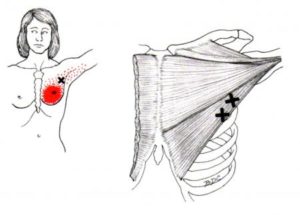 We call this condition False Cardialgia because when it occurs on the left side of the body, it often sends people to the doctor in fear of a heart condition. Active trigger points in the pectoralis major and minor muscle can cause: